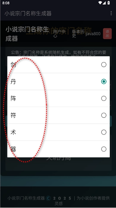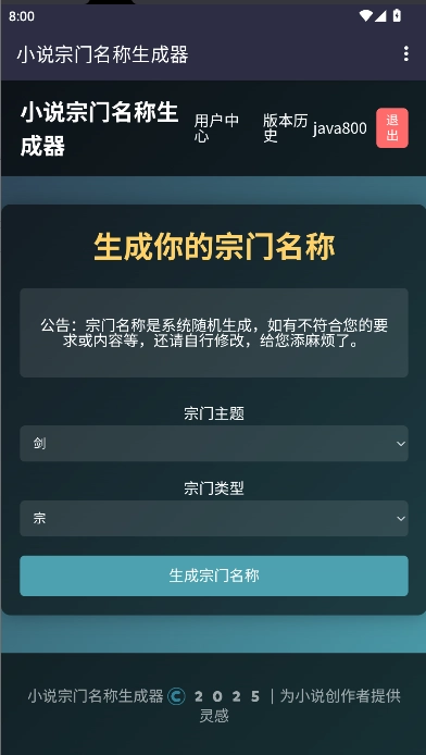 小说宗门名称生成器是一款能免费帮你生成各类玄幻小说宗门名字的软件,堪称小说创作的得力助手。它可随机生成宗门名称,助你轻松构建玄幻世界。若你有创作玄幻小说的需求,完全可以直接免费使用这款软件,它会自动为你免费生成各种合适的名字!