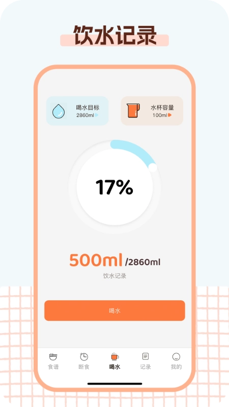 设定每日饮水目标,每次饮水后点击“喝水”按钮记录饮水量,防止断食时出现脱水情况
