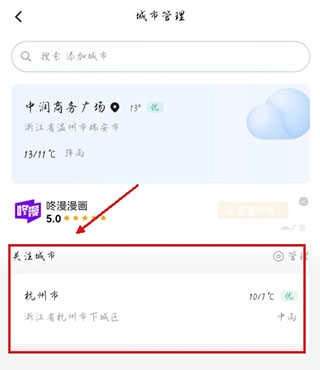 当选择好目标城市并确认添加后,该城市的实时天气情况就会同步展示在主界面上,便于用户随时查看。