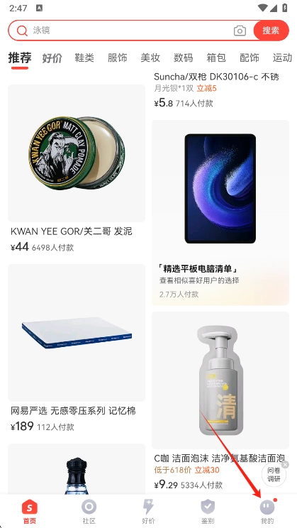 打开识货,随后点击右下方选项我的