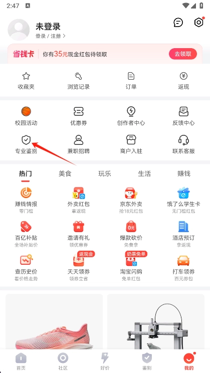 在识货工具栏处,点击专业鉴别,选择实物鉴别