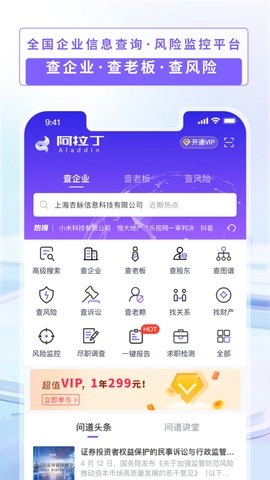 阿拉丁是上海问道云人工智能科技有限公司推出的高效办公工具,面向企事业单位、机关(特别是政法系统、金融行业)、广大企业及相关人士,提供全面、准确、高效的企业信息查询服务;通过全方位分析评估,预警防范并处置化解各类风险,助力企业与经济实现高质量发展。
