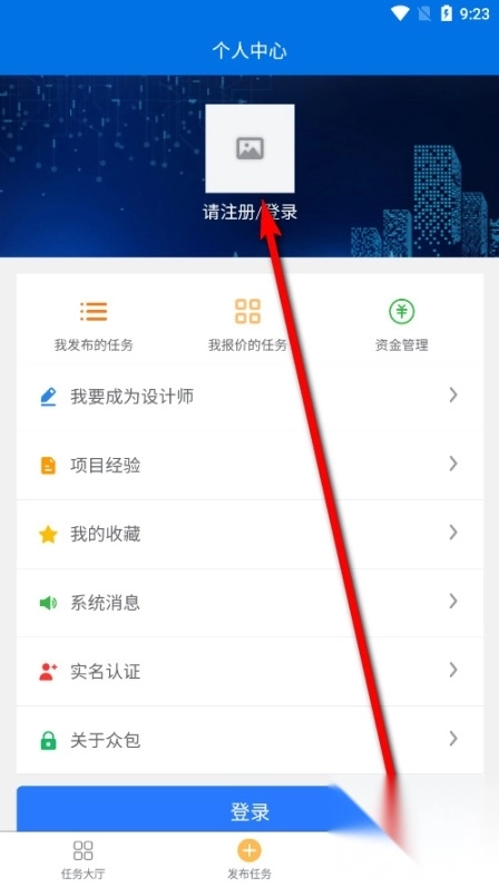 打开沐风众包,在“我的”页面里找到【请注册/登录】选项。