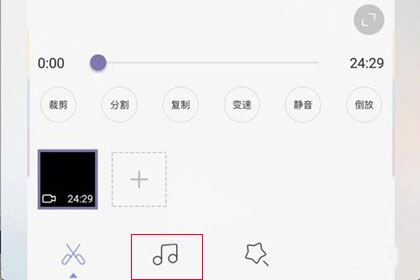 接下来我们就能对添加好的视频进行编辑操作了,只需点击底部的音乐按钮,就能打开音乐便捷功能列表,在这个列表里选择“音乐”功能,就可以为视频添加配乐了。