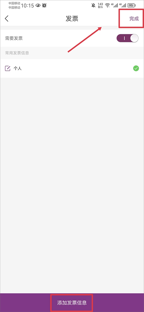 如果是个人开具发票,直接点击右上角的“完成”按钮即可;若是企业开票,则需要点击下方的“添加发票信息”选项。