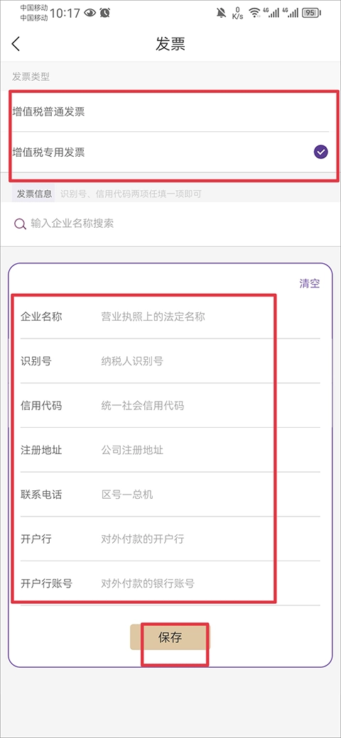 接着选择发票类型,再把企业名称、识别号、信用代码、注册地址、联系电话、开户行以及开户行账号这些信息补充完整,之后点击保存按钮。