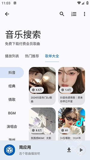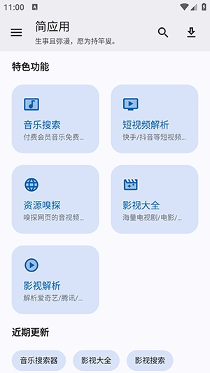 简应用是一款十分受欢迎的资源搜索与实用工具箱结合的应用。它的最新版本配备了强劲的搜索引擎,能为用户提供海量的优质资源检索服务,涵盖视频、音乐、图片等多种类型。此外,简应用还集成了丰富多样的实用小工具,几乎能满足用户的各类需求,堪称日常生活中必不可少的便捷帮手!