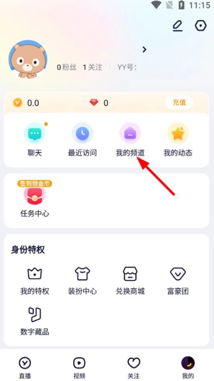 在安装软件,进入我的页面,点击"我的频道"。