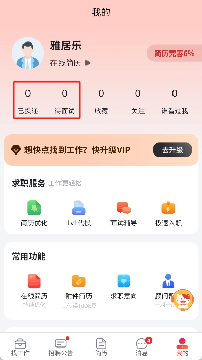 用户可在“我的”界面实时查看求职状态,包括简历投递情况、面试邀请等信息,以便及时掌握求职进度。