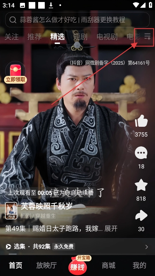 在视频播放页面,点击右上角的分类图标,即可打开频道选择界面,切换内容类型十分便捷。