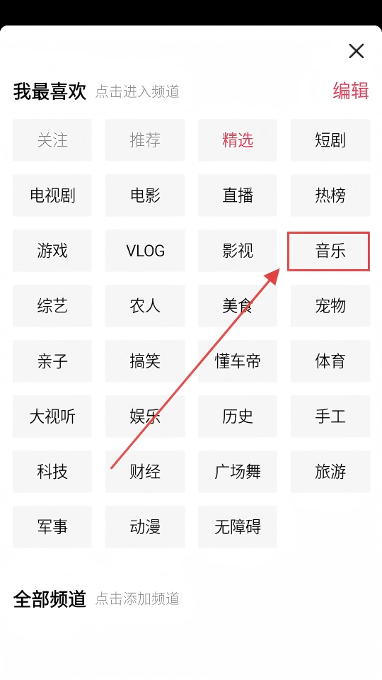 在频道选择界面,找到【音乐】频道并点击,即可进入音乐内容页面,尽情享受音乐。