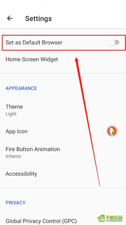 进入设置页面后,找到并点击“set as default powser”选项,即可把DuckDuckGo设为默认浏览器。