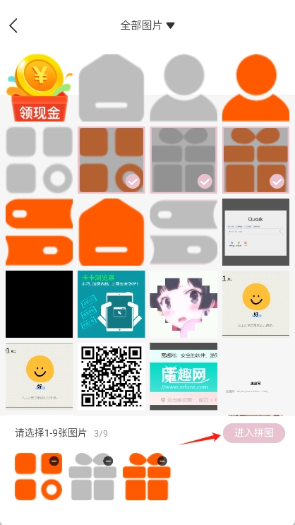 回到主界面后,点击拼图功能,从相册里选好图片,接着点击“进入拼图”按钮。