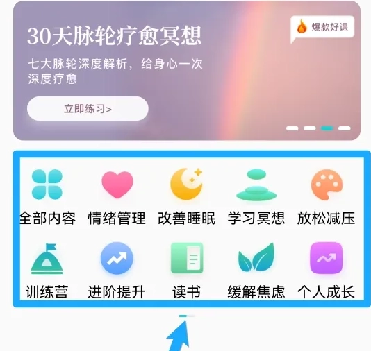 100+运动、100+读书、瑜伽专区、进阶提升这四项内容,都位于【首页】顶部广告下方的横拉模块区域。
