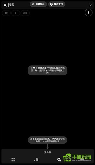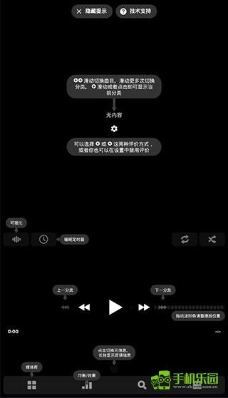 这是poweramp的主界面,在这里你能进行滑动切换曲目、多次滑动切换分类等操作,也可以通过滑动或点击来展示当前分类。