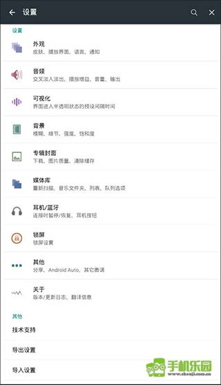 在设置界面中,你能够对软件进行个性化配置,像界面外观、声音效果、视觉展示、背景样式、唱片封面、媒体资源库、耳机与蓝牙连接、锁屏显示等方面都可以调整。