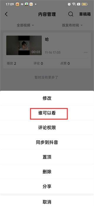 接下来进入内容管理页面,就能看到自己已发布的视频。在此处挑选需要设置为公开可见的视频,然后点击该视频右下角的【三点图标】。