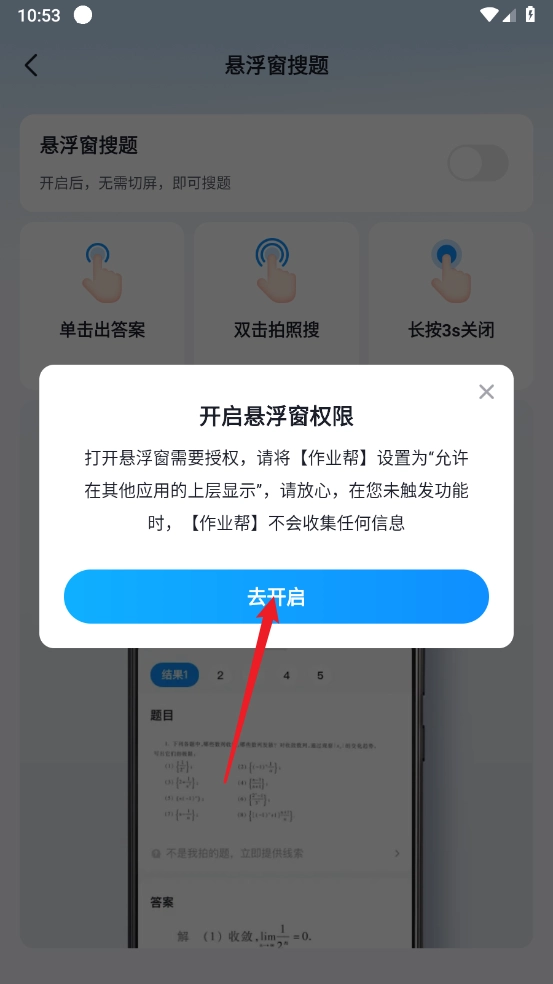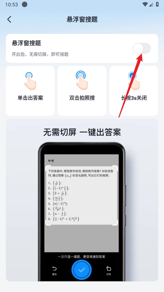 最后返回主页,即可点击悬浮窗开关进行搜题。