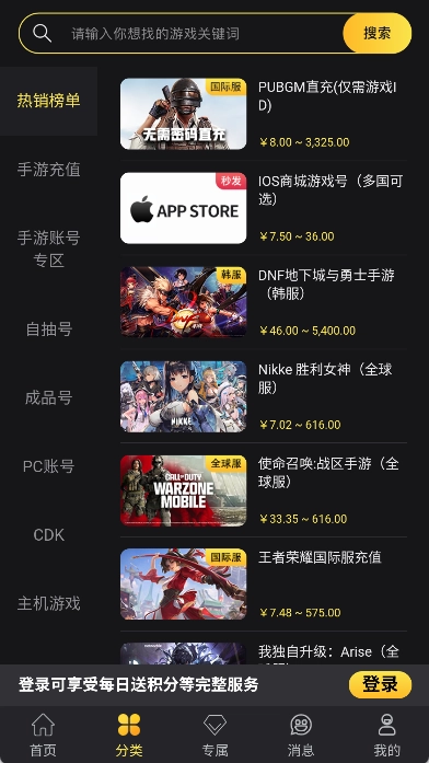 bigplayers正版是一款出色的游戏服务平台,专门为热爱游戏的玩家打造一站式服务体验。平台全面覆盖手游、端游以及Steam等丰富多样的游戏类型,提供游戏充值、账号交易、道具购买等多元化服务,让玩家在享受游戏乐趣的同时,也能拥有安全便捷的购物体验。另外,bigplayers游戏交易平台还为新注册用户准备了一系列福利。感兴趣的朋友们快来体验吧!
