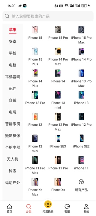 在分类页面,能够浏览到适用于苹果、安卓、平板以及电脑等不同类型的商品。