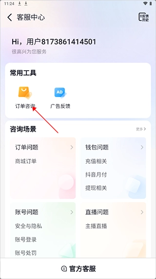 用户可在抖音商城的【我的】页面,点击顶部那个类似“三”形状的图标,之后选择【我的客服】选项。