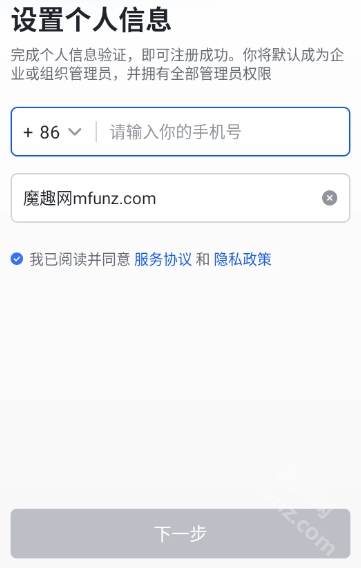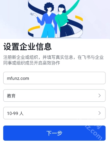 最后把企业或组织名称、行业类型、人员规模之类的信息填写完毕后,点击下一步按钮即可。