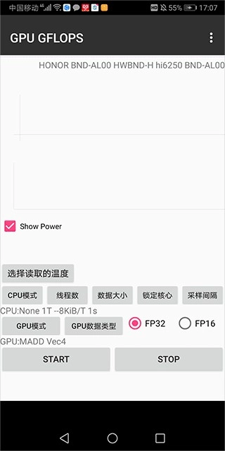 打开软件后,界面会呈现手机GPU的实际功率消耗数据,用户可挑选一个GPU功率数值来开展测试。