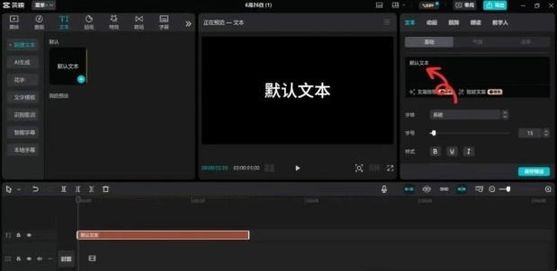 打开剪映后,在界面左侧找到“文本”选项并点击。进入文本界面后,找到“新建文本”区域,其中包含“默认文本”选项,点击该选项旁的“+”号,即可将默认文本添加到时间线中。