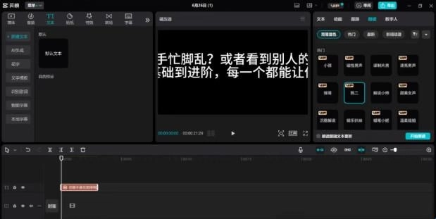 在时间线上选中对应的文本内容,接着在界面右侧找到“朗读”功能选项。随后挑选一个你觉得合适的音色(比如我当时随意选了“熊二”这个音色),点击“开始朗读”按钮。完成这一步操作后,系统会自动在时间线上生成一段与所选文本对应的音频。