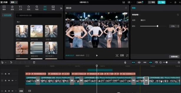 剪辑完成后,在左侧的转场区域挑选合适的转场效果,点击“+”号进行添加,接着点击右侧的“应用全部”按钮,如此一来,所有镜头之间的切换就都能添加上转场效果了。