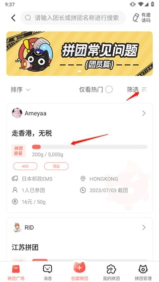 在拼团中心里,你能够通过输入团长姓名或者拼团名称,来挑选自己想要参与的拼团。