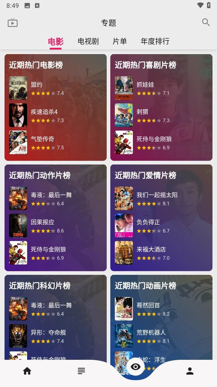 此外,该软件还配备了实时排行榜功能,包含电影、电视剧以及年度榜单等各类分类。