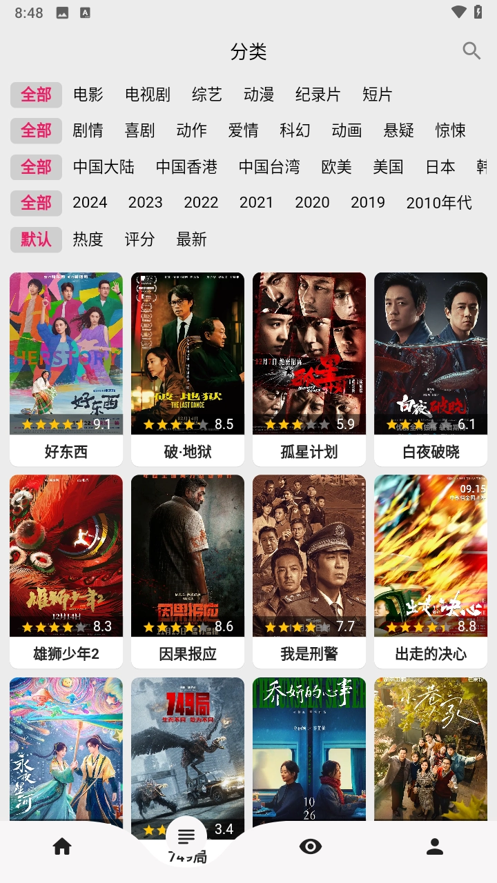 软件贴心地对影视资源进行了合理分类,按照类型、地区、年代、热度、评分等维度进行划分,方便用户快速找到自己喜欢的作品。