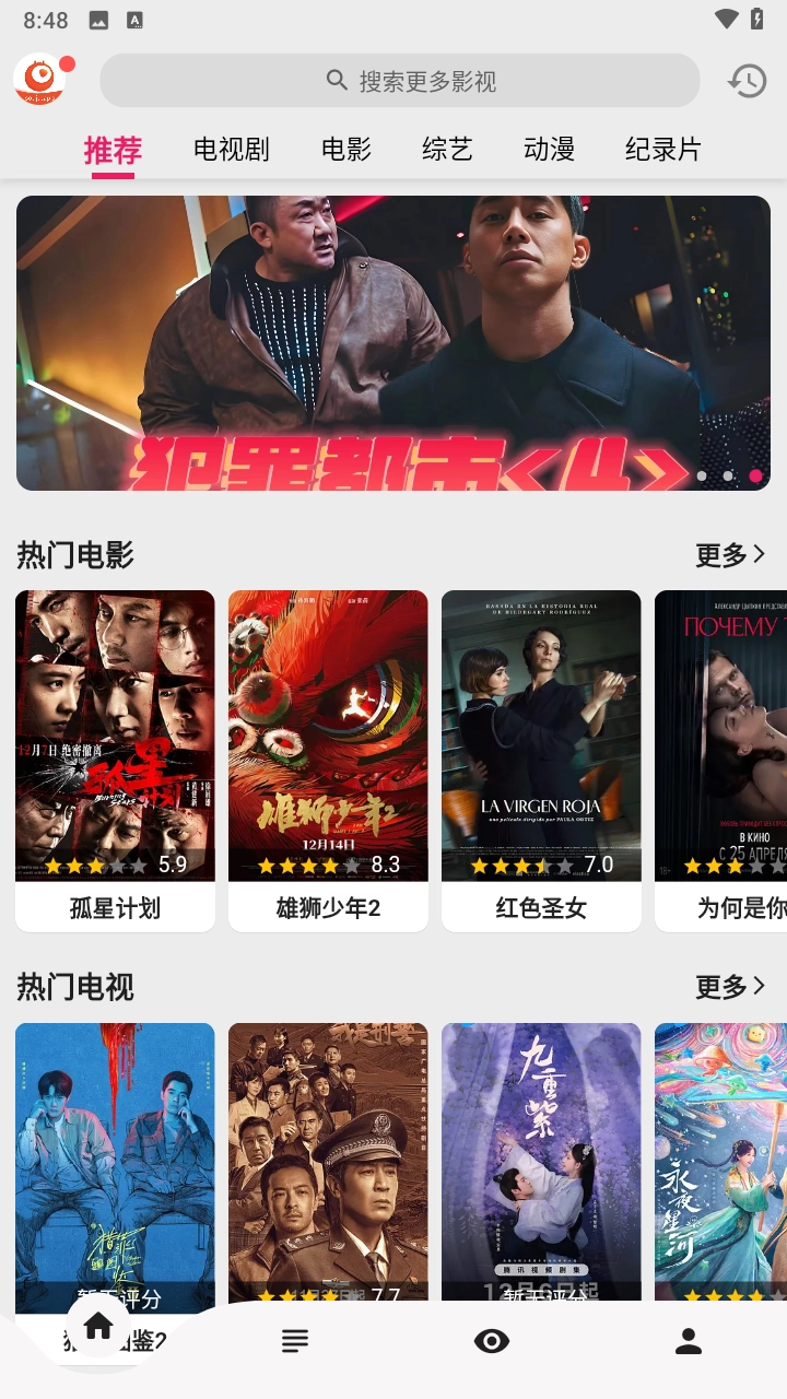 进入主界面后,能看到简洁清晰的设计风格,首页呈现了最新和最热门的电视剧、电影、综艺、动漫以及纪录片等内容。