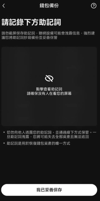 当然已经建好了,但得另外备份才能查看,所以接下来要做的就是备份钱包并抄写助记词。不然万一哪天你用来登录这个钱包的手机或电脑不小心丢了,你就没法使用这个钱包了,不过要是有了助记词,就能在其他钱包里通过导入助记词继续使用。