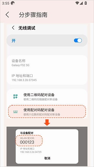 接下来点击“无线调试”里的“使用配对码对设备进行配对”