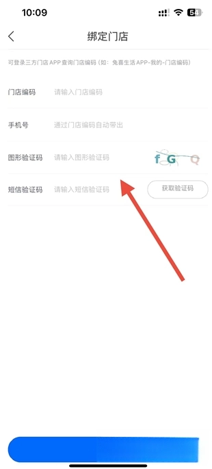 在门店绑定页面依次填写门店编码、图形验证码与短信验证码,接着点击提交按钮,即可完成门店绑定操作。