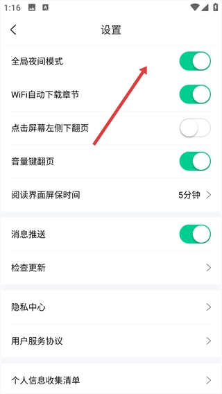 开启后可切换到夜间阅读模式。