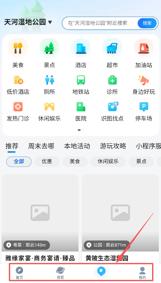 探索周边:能发现附近适合吃喝玩乐的好地方,选择周边功能就能带你游览这些好去处。