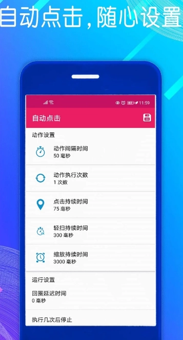 它包含丰富多样的动作配置选项,像动作时间间隔、执行时刻、点击持续时长等都在其中。